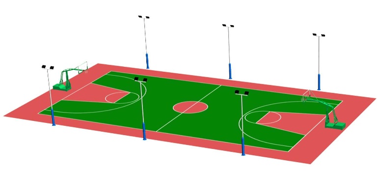 为了保证篮球场地的夜间比赛和训练,需要安装合适的照明系统。照明系统的亮度和分布应能覆盖整个比赛区域,并且没有盲区。照明系统的安装位置和角度应根据场地的尺寸和形状来确定。