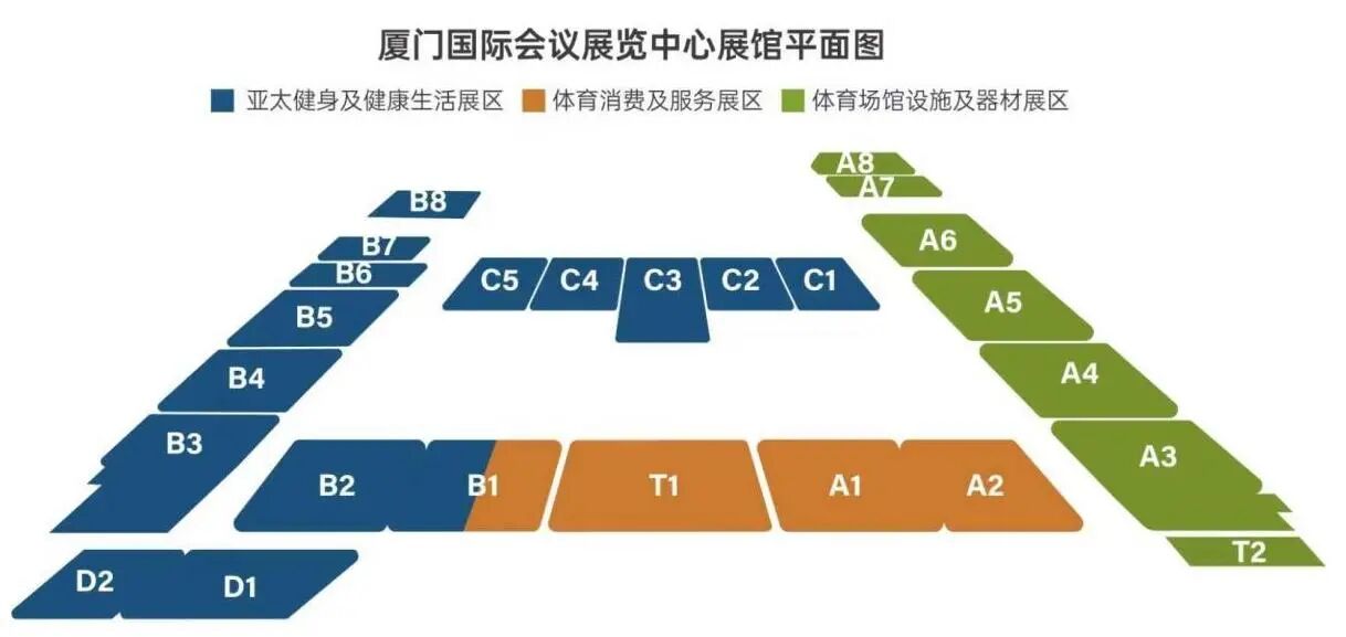 2026中国体博会展区规划-蓝色区域为亚太健身展 明年五月,2026中国体博会即将启幕厦门。据悉,全新打造的2026中国体博会亚太健身及健康生活展区(以下简称 亚太健身展 ),组委会以 全品类集结,健享新未来 为展区主题,将原商用健身板块及家用健身板块内容以 市场端用户决策流程 作为出发点进行细分,从 需要哪种健身方式 到 在哪里运动健身 ,再到 提升健身体验的新途径 ,最终通过配套服务完成闭环。与此同时,还结合器材功能、使用场景、目标人群及行业趋势等核心维度,为展示方及观展方更加精准对接提供更为专业的展品类别规划,逐步打造由中国体博会倾情呈现的亚太地区规模最大、最为专业的健身器材及健身服务、身心健康及福祉相关内容为核心的行业盛会。