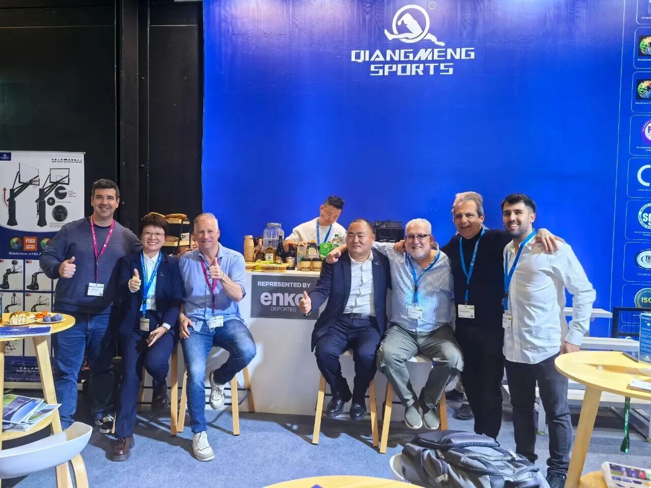 强盟体育FSB 2025展位 北京强盟体育发展有限公司(以下简称 强盟体育 )总经理侯跃在走访交流中向联合会一行表示: 无论是参展FSB还是中国体博会,产品过硬是关键。展会则是为我们参展企业搭建沟通的桥梁,通过参展展现综合实力,以吸引国内外买家进行合作。参展多次后我们发现,常常在参展、布展等各个环节的细节处理上关乎与某些客户合作的成败,因此我们非常珍惜每一次参展助力业务拓展的机遇。 侯跃说道。 正是在不断摸索企业 出海 之旅的过程中,侯跃观察到,海外买家具有完全不同国内买家的独特社交属性和认知习惯。由此,强盟体育在FSB 2025的展位设计中采用了创新策略。据侯跃介绍,海外客户对展位的视觉设计有很强的辨识度,还注重社交细节,强盟体育此次在展位上特别设置了酒吧区,以便买家休息、交流乃至促成交易。 实际效果表明,这种设计比单纯展示产品更有效。咖啡机和啤酒的配套服务,显著提升了客户体验和社交互动,更高效地促成了订单达成。 海外客户偏好坐高脚凳,这体现了国外的社交方式 他们对展位的桌椅设施等要求极高,源于对细节和社交礼仪的重视。 侯跃进一步分享自己对于海外客户的洞察。 据悉,强盟体育的外贸市场目前主要布局于亚洲和欧洲地区,尤其在中东和东欧市场的反响热烈。此次参加FSB 2025,强盟体育主打的仍然是其多年来形成核心竞争力的体育器材 拳头 产品 篮球架系列。