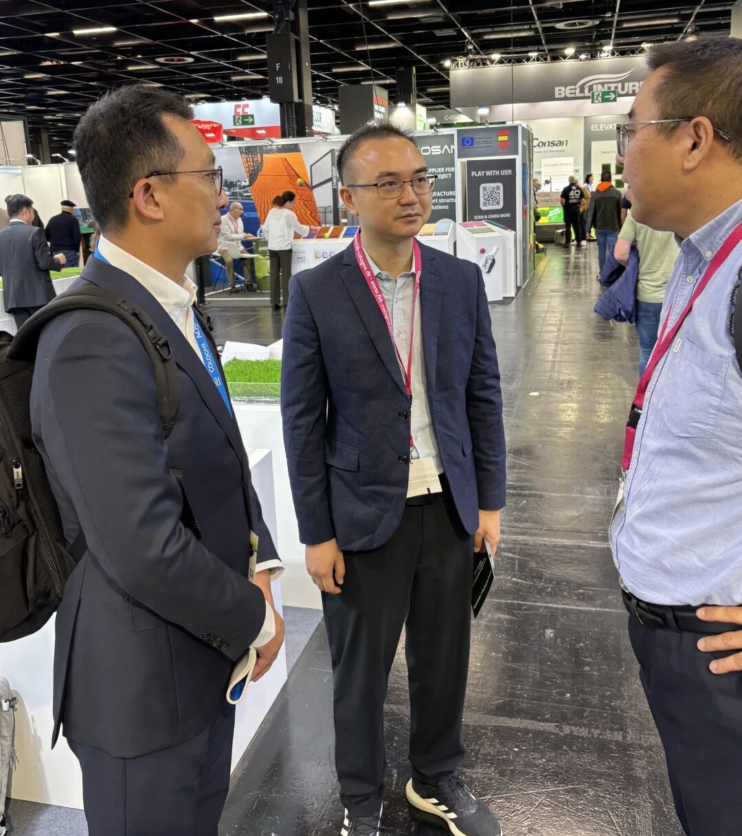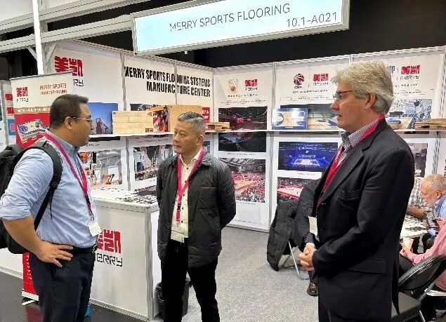FSB 2025现场 10月28-31日,FSB 2025在德国科隆举行,今年展会共计吸引578家企业参展,其中中国企业97家(60家企业参加过中国体博会)。鉴于近年来中国体育场馆设施及器材企业 出海 积极开拓海外市场业务 已成为该行业未来增长的共识,因此今年的中国参展企业数量较往年显著增加。在今年的FSB 期间,联合会一行相关领导及人员一如既往到场参观,并积极与全球买家交流,助力中国参展企业拓展其合作网络和国际市场机遇,并积极收集海外一线市场的信息和反馈,为2026中国体博会优化海外推广策略积累经验。 联合会一行在走访FSB 2025中国参展企业的过程中,作为2026中国体博会参展企业的广东杰锐新材料有限公司、北京强盟体育发展有限公司、广州傲胜人造草股份有限公司等企业相关负责人表达了此次参加FSB的真切感受。